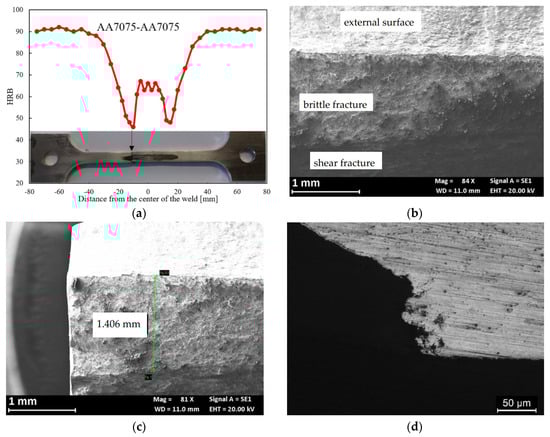 (a) Hardness profile along the FSW butt joint; (b) SEM image of the fracture surface, a flat zone of about 1 mm of growth (close-up in (c) is highlighted in (d)) metallographic section of the fracture surface in which is visible the flat zone and the small ramifications.