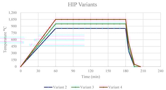 The HIP process applies high pressure to the exterior of a part via an inert gas. The elevated temperature and pressure cause sub-surface voids to be eliminated through a combination of plastic flow and atom/vacancy diffusion. In this project, the specimens were exposed to several Hot Isostatic Pressing parameters, separating into different groups according to different HIP exposures as shown in Table 1. Figure 2 compares the HIP treatments according to their respective temperatures and cooling times. Variant 1 is denoted the as-built condition, where no HIP was applied. Variants 2 through 4 were HIPed under the same pressure of 103 MPa for 120 min. Variant 2 was held at a temperature of 850 °C, which is below the beta transus. Variant 3 was held at a standard HIP temperature of 950 °C, and finally, variant 4 was held at a temperature of 1050 °C, which is above the beta transus (~994 °C). For the three HIPed variants, a QIH9 system with Uniform Rapid Cooling (URC) furnace in molybdenum (Quintus Technologies LLC, Lewis Center, OH, USA) was used at a furnace cooling rate of 100 °C/min.