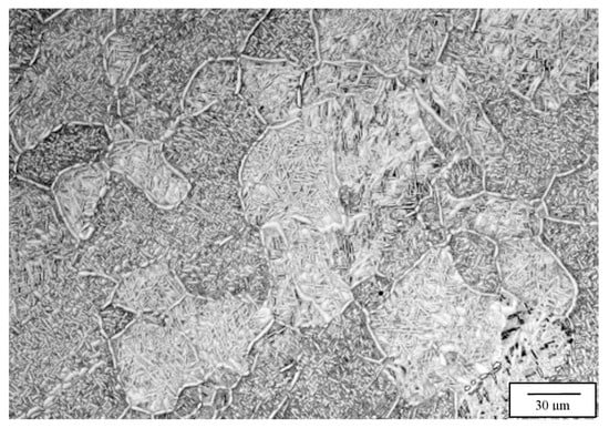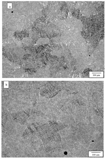 Figure 3 compares the as-fabricated (variant 1) microstructures for the Arcam A2X (Figure 3a) and Q20 (Figure 3b) EBM systems. Notable features are the equiaxed grain structures with similar grain sizes of 214 and 257 microns, respectively, for the A2X and Q20 EBM systems. These equiaxed grain structures correspond to moderate thermal gradients and solidification rates for solidification maps where plots of thermal gradient versus solidification rate determine the grain morphology differentiated by columnar grains versus varying sizes of equiaxed grains for both SLM and EBM fabrication of alloys, as recently reviewed by DebRoy, et al. [26]. Both images in Figure 3 show some porosity, and this is expected for measured densities of 4.51 and 4.49 g/cc, corresponding to Figure 3a,b, respectively. The nominal solid density for Ti6242 in the literature varies from ~4.52 to 4.54 g/cc [6,7], which compares favorably with the nominal, solid density of 4.53 g/cc measured for the specimens fabricated by both Arcam machines and HIPed at 1050 °C. Consequently, the measured densities for Figure 3a,b correspond to 99.6 and 99.2%, respectively. In Figure 3a,b the essentially fully dense, acicular alpha-prime martensite composing a Widmanstätten-like microstructure within the grains is also notable, having an average acicular thickness averaging ~0.6 microns. These features are better illustrated in the magnified images of Figure 3 shown in Figure 4. Since alpha-prime martensite has an hcp crystal structure and associated lattice parameters are essentially indistinguishable from the hcp alpha phase, it is difficult to distinguish from the alpha phase. However, in optical (light) metallography, the etchant renders the acicular alpha-prime dark or black as shown in the large grain marked in Figure 4a, while the acicular alpha phase appears white, as marked in Figure 4b. In addition, while acicular alpha occurs somewhat randomly, the alpha-prime martensite is often coincident with the hcp {0001} planes which can intersect at 90° as evident in many of the grains in Figure 4a,b. It can also be observed that some grains and grain portions contain short, acicular alpha with the same thickness as the martensite, as evidenced by the short, white features noted in Figure 4b. Nonetheless, the volume fraction of the acicular martensite (as observed qualitatively) far exceeds the acicular alpha. These features were observed more than three decades ago for the weld fusion zone of rapidly cooled Ti6242 alloy by Blaeslack and Mullins [20] where, at very high cooling rates (~500 °C/s), martensite dominated the microstructure, while an increasing volume fraction of acicular alpha emerged with decreasing cooling rates (by alpha-prime decomposition to alpha), creating alpha colonies at a cooling rate of ~7 °C/s. Similar microstructure features have been more recently observed in the laser-welding of both Ti6242 and Ti-6Al-4V (Ti64) alloys [21,27,28,29], and the same acicular alpha-prime martensite microstructures have been recently observed for the selective-laser melting (SLM) of Ti64 [11,12,30]. It is also of interest to note that Ter Haar and Becker [11] and Yang, et al. [13] have discussed a specific range of length regimes (from nano to micron) for alpha-prime martensite in Ti-6Al-4V, but their origin and specific influence on properties have not been discussed. In this regard, the short segments of alpha phase prominent in Figure 4b are also not understood.