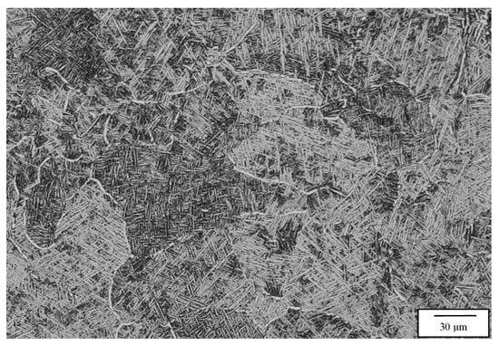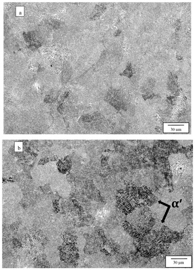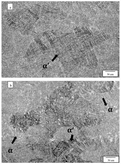 The hardness measured in this prior research [20] also decreased systematically by ~12%. In the present study, corresponding hardness also decreased somewhat inconsistently, as shown in Table 3 and Table 4, and only varied by ~7%. Similar results for tensile property variation with acicular alpha-prime/alpha content have also been observed for both variously welded Ti-6Al-4V [28,29], as well as laser (SLM) and electron beam (EBM) processing and heat treatment of Ti64 [7,9,10], where additional anomalies and superior ductility have been achieved by the post-heat-treatment processing.