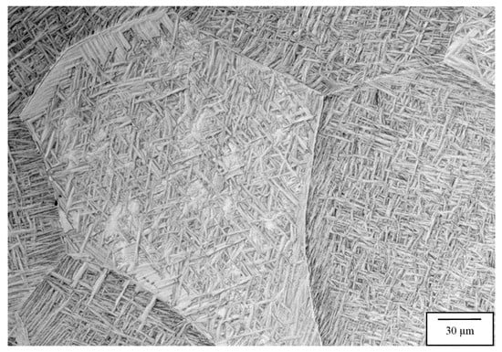 Figure 6, Figure 7, Figure 8 and Figure 9 compare the post-process, HIP microstructures at 950 °C (Figure 6 and Figure 7) and 1050 °C (Figure 8 and Figure 9), respectively. At 950 °C (variant 3), the equiaxed grains have grown slightly from the 850 °C HIP (Figure 5), but the most notable microstructure feature is the transformation of the acicular martensite to acicular alpha, represented by short segments of alpha in Figure 6 in contrast to a fairly well defined acicular alpha Widmanstätten microstructure in Figure 8. The acicular alpha in both Figure 6 and Figure 8 have an average thickness of ~0.6 microns. There is also a notable grain boundary regime of alpha in both Figure 6 and Figure 8. It might also be pointed out that the alpha phase in Figure 4b, Figure 6, Figure 7, Figure 8 and Figure 9 demonstrate a wide range of lamellar or acicular lengths, as noted above, from ~5 microns in Figure 4b and Figure 6, 20 microns in Figure 7 and 5 to 15 microns and ~5 to 60 microns in Figure 8 and Figure 9, respectively.