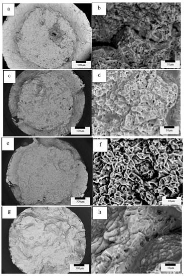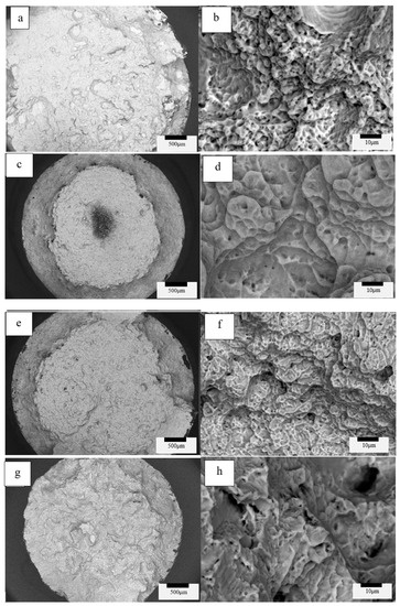Variants 1 (a,b), 2 (c,d), 3 (e,f), 4 (g,h) for the Arcam Q20-processed and post-processed tensile fracture surfaces.