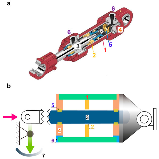 (a) Physical map and (b) Working principle of the hydraulic servo-actuator. 1. Cylinder; 2. Piston; 3. Piston rod; 4. End cap; 5. Seal ring; 6. Pipe orifice; 7. Signal feedback device.
