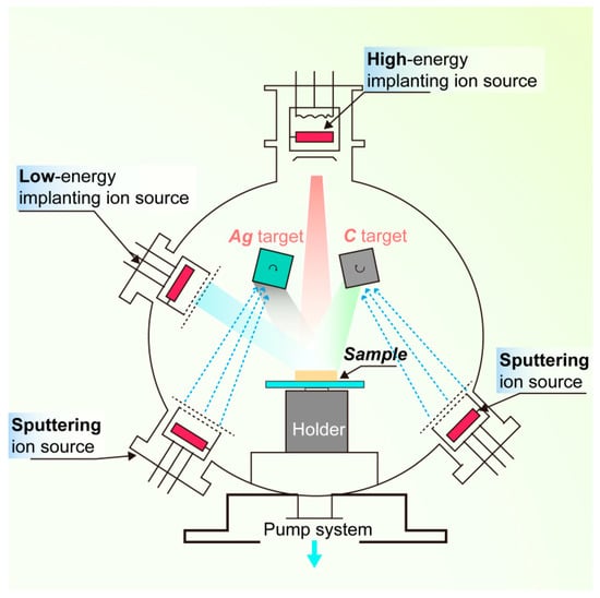 Figure 2 shows a schematic diagram of multi-ion beam assisted deposition (IBAD) system (SP9060, PowerTech, Beijing, China). The base vacuum was set to 1.8 × 10−4 Pa, and the deposition pressure was fixed at 1.5 × 10−2 Pa. The substrate was initially bombarded with an Ar+ beam of 15 kV/20 mA (ion source voltage/ion beam current) for 10 min for a fresh and clean surface. Subsequently, a 0.2 μm-thick Ag interlayer was deposited by singular sputtering of Ag target (silver, purity of 99.99%) (Zhongnuo Advanced Material Technology Co., Ltd., Beijing, China) at 1200 eV/35 mA. Then, a 0.8 μm-thick layer (a:C-Agx) was synthesized by the simultaneous co-sputtering of Ag and C targets (carbon, purity of 99.99%) (Zhongnuo Advanced Material Technology Co., Ltd., Beijing, China). The co-sputtering was performed by (1) the Ag sputtering current varying from 0 to 50 mA while maintaining the energy constant at 800 eV; and (2) constant C sputtering current and energy of 80 mA and 1300 eV, respectively. Six samples of Ag-DLC films (approximately 1 μm-thick) were prepared and denoted as A0–A5 in Table 1.