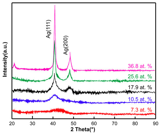 XRD diffraction patterns of Ag-doped diamond-like carbon (Ag-DLC) films with 5 Ag contents.