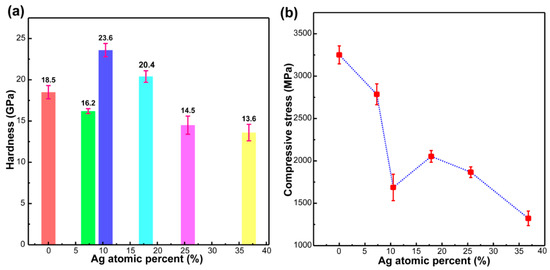 Figure 4 shows the measured hardness and intrinsic (compressive) stress of the Ag-DLC films as a function of the Ag doping. As shown in Figure 4a, the hardness of the Ag-DLC films ranges within 13.6–23.6 GPa, and the value decreases with the increase Ag content due to the soft nature of the doped Ag. The hardness of the films is higher than the maximum working stress (10 GPa) of the system, and it is significantly higher than that of the AISI 440 substrate (ca. 7 GPa). Such film may enable the component thereon to have an outstanding wear resistance against the particles. Similarly, the compressive stress (Figure 4b) of the Ag-DLC films tends to decrease with the Ag content.