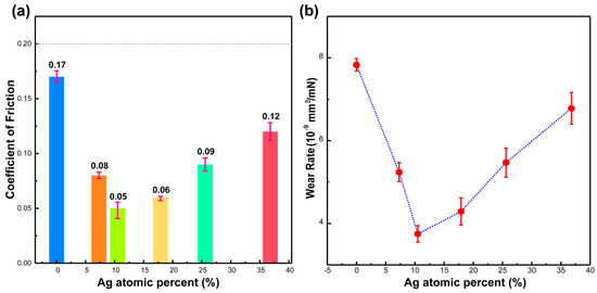 (a) Friction coefficient and (b) Wear rate of Ag-DLC films as a function of the Ag content.