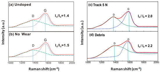 Figure 7 compares the Raman spectra of undoped DLC film and a:C-Ag10.5% film under a load of 5 N. In Figure 7, the four Raman spectra correspond to undoped DLC film, as-deposited films (no wear) before the frictional test, wear track, and debris of the films after the frictional test, respectively. In the Raman spectra, two structural aspects (i.e., G- and D-peaks and IG/ID values) are individually discussed.