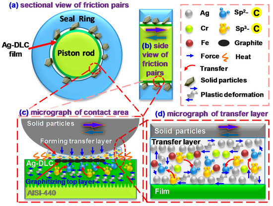 - The transfer layer plays a self-lubrication role and extends the seal life. As shown in Figure 8c, the transfer layer is formed between the film and the solid particles under the action of a contact force and friction heat. This layer is formed to avoid the direct contact between the two frictional surfaces. In Figure 8d, Ag is deformed in the transfer layer and diffuses to the surface of the transfer layer.In the initial stage of the reciprocating friction, the contact force brings the two contact surfaces to wear, producing debris containing Ag particles, sp3-C, sp2-C, Fe, and Cr between the contact surfaces. Owing to the accumulation of the friction heat, sp3-C bonds are converted into sp2-C bonds and diffuse toward the surface of the film, resulting in the graphitization of the film surface (Figure 7). Under a contact force and friction heat, the graphite is generated between the two contact surfaces and reacts with the debris, forming a transfer layer. This transfer layer is formed to prevent direct contact between the solid particles and the film. When a force is applied on the transfer layer, solid particles are squeezed into the transfer layer, generating a high strain in local areas to increase the corresponding internal stress. Under the action of an internal stress, soft and flexible Ag undergoes plastic deformation, upon which local microstrains can be released, and it reduces the internal stress for improving the film toughness. Thermal diffusion caused by the friction heat allows Ag to diffuse and accumulate at the contact surface, and this metallic Ag of low shear stress acts as a solid lubricant. During the friction process, both graphite and Ag particles presented in the transfer layer serve as solid lubricants and thus allow the transfer layer to share its self-lubricating characteristic. The occurrence of a transfer layer prevents the Ag-DLC film from direct destructive contact with the particles. Consequently, the self-lubricating performance of the transfer layer allows the coated piston rod to have a prominent low wear rate (3.8 × 10−9 mm3/mN, Figure 5) and a longer life. This wear rate is much lower than that reported by Bin Mustafa, M.M. et al. (15–35 × 10−9 mm3/mN) [25]. By means of the transfer layer, Ag doping improves the toughness of the film. Both soft Ag particles and the graphitized top layer serve as solid lubricants and extend the service life of the friction pair.