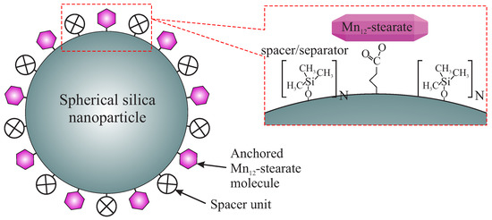 The motivation of the present work is to investigate the effect of the concentration of spacer units on the silica surface on the magnetic properties of this material (being the nanocomposite consisted of Mn-st and spherical silica substrate). To demonstrate how the concentration of spacer units affects the static and dynamic magnetic properties, we prepared four samples with the various distribution of Mn-st SMMs and different way of its immobilization (implying various degree of freedom) at the silica surface (we prepared four samples: three of them posses highest concentration of the SMMs, but various number of their anchoring points, and one has significantly lower concentration of magnetic molecules—samples are listed and described in the Section 2.1). The assumed concentration of anchoring points (influencing on the degree of freedom of SMMs and their distribution for some cases) is preserved thanks to the use of spacer units [14]. The structure of the materials is presented in Figure 1.