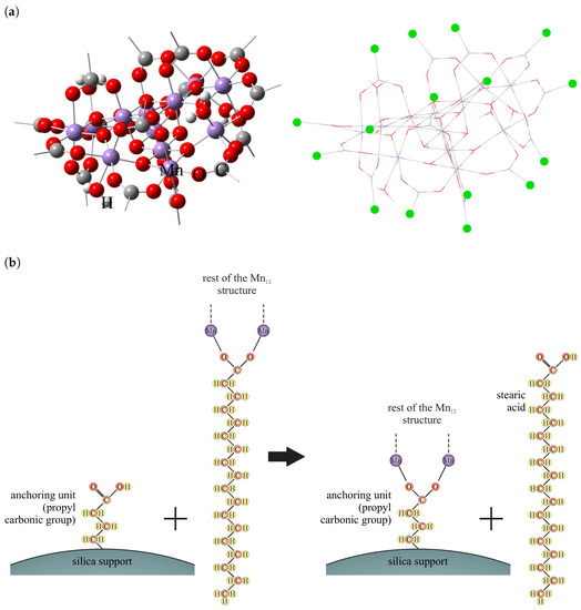 A model of the Mn core with carboxylic acid units (-COO) (left side presented as a balls and bonds, right side as sticks for better visualization) (a). Alkane chains are omitted for clarity. At the stick diagram: green dots are a points of the attaching of the alkane chains and anchoring units from silica. At the figure (b) the way of Mn attaching to the surface of the pre-functionalized silica.