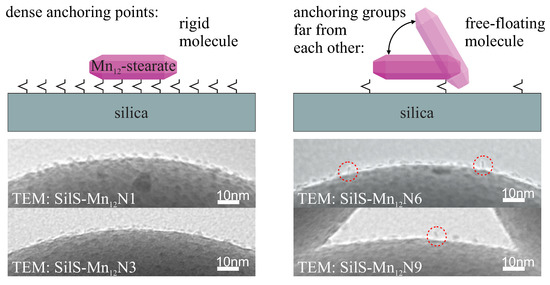 It can be clearly seen, that the Mn-based molecule posses 16 attaching points: eight at the circumference, four at the upper side and next four at the bottom. Assuming the umbrella-like configuration of the anchored Mn[12], the SMMs can be attached through 1–4 points. One can imagine, that the number of bonds between the surface of the silica and SMMs depends on the density of anchoring units at the silica surface—when anchors are densely placed, the Mn can be bonded via multiple points (two, three or even four). In this case, SMM is relatively rigid. For the anchoring units placed relatively far from each other, the magnetic molecule can be bonded by a single point and can be easily spatially reoriented. This situation was depicted in Figure 4, along with TEM images confirming our theory.