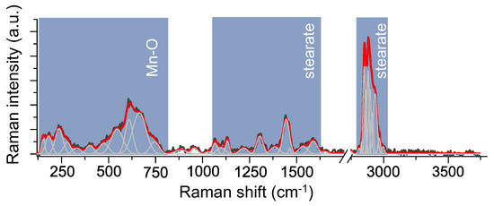 The supported structural characterization of molecular magnets was done on the basis of the Raman spectroscopy. To correctly analyze the two-composite system, firstly, it is crucial to analyze and interpret more precisely the reference bulk Mn-st (Figure 5). The Raman spectrum of bulk molecular magnets may be divided into three spectral regions: (i) 200–770 cm determined by stretching and deformational vibration of Mn-O bonds, (ii) 1100–1800 cm assigned to deformational modes of methyl and methylene groups of the stearate and stretching modes of coordinated carboxyl groups, (iii) 2800–3100 cm linked to the symmetric and asymmetric stretching vibration of methyl (CH) and methylene (CH) groups in alkyl configuration of stearate [16,17,18].