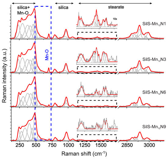 In turn, the analysis of Raman spectra of the surface-functionalized silica-based systems (see: Figure 6) turned out to be problematic. It is because the strongest bands originated from Mn-st become very low in the intensity in comparison to bands typically ascribed to the silica bands. It is quite problematic in the low-frequency region, especially considering bands originated from Mn-O modes which generally overlap with the silica bands. It seems that only band located at 704 cm can be analyzed whereby its intensity becomes still relatively low. A similar scheme was found for all analyzed composites. It is also observed that the intensity of Mn-O band seems to different, considering systems with variable concentration of anchoring units, that is, it is similar for two highest content of rigidly anchored molecular magnets (samples SilS-MnN1 and SilS-MnN3) and slightly lower for samples SilS-MnN6 and SilS-MnN9. However, the more precise analysis of the number of molecular magnets anchored to the silica seems to be difficult and burdened of some uncertainty. Thus, crucial is to look more in detail at another spectral range.