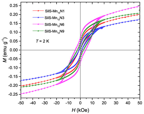 The magnetic relaxation measurements, performed for the temperature range 2.0 K–3.0 K, are presented in Figure 9. The magnetization values at 2.0 K of the first recorded point reveal that, SilS-MnN1 and SilS-MnN3 preserves about 20% of the value measured at 50 kOe. In case of SilS-MnN6 and SilS-MnN9 samples, this factor is higher and reaches about 30% of the value measured at 50 kOe. To qualitatively evaluate the magnetic relaxation, the time dependence of the magnetization data were analyzed with the stretched exponential function [25]: