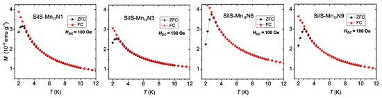 Magnetization dependence on the temperature for value of magnetic field H = 100 Oe of SilS-MnNX (X = 1, 3, 6, 9) samples.
