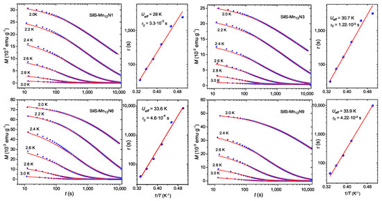 Dependence of magnetization on the time for SilS-MnNX (X = 1, 3, 6, 9) samples at the 2.0–3.0 K temperature range (the solid lines are the best fits to the stretched exponential function (1)) and corresponding relaxation times in function of inverse temperature (solid lines represent the best fit to the Arrhenius function (2)).