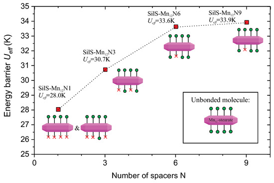 Nevertheless, looking at the overall trend (Figure 10), we can notice that the energy barrier is slowly, but continuously increasing, with the increasing of the number of spacer units to the six spacers (SilS-MnN6). The SilS-MnN9 sample presents almost the same energy barrier, as the SilS-MnN6 one. Both samples (SilS-MnN6 and SilS-MnN9) have SMMs anchored in a similar way by a single bonding point, while for samples SilS-MnN1 and SilS-MnN3 deposited SMMs have more anchoring points. Thus, the value of energy barrier can be related with the structure of the anchored Mn-st molecules. The ideal Mn-st molecule possesses 16 stearate acid ligands: eight at the circumference, four at the upper side and next four at the bottom. Attaching the molecule to the silica’s surface with a single point involves substitution of a single stearate unit with a propyl carbonate one, double point involves two substitutions and so on up to four [13]. Assuming the umbrella-like configuration of the Mn-st, the SilS-MnN1 sample has the most distorted and anisotropic structure, SilS-MnN3 is less distorted, while SilS-MnN6 and SilS-MnN9 materials have the least perturbed structures and the most symmetrical (both samples presents a similar way of the anchoring of SMMs). Therefore, the observed differences in the energy barrier can be explained as a consequence of the deposition on the surface, which introduce the modification of axial anisotropy. In consequence, these leads to the modification of the energy barrier for deposited SMMs in contrast to the bulk ones [28,29,30].