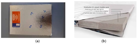 Commercial vacuum insulation panel (VIP) produced by Vaku-Isotherm GmbH (Frankenberg, Germany): (a) general product, (b) structure of the VIP.