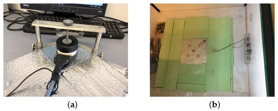 The other method, the hot plate method in Figure 4b, is a standardized approach for measuring the thermal conductivity of target materials. In this method, a sample with a reference material is placed on the top of a calorimetric chamber, with the heat applied from underneath. Based on the known thermal conductivity of the reference material and the heat flux that passes through the two layers, the thermal conductivity of the target material can be ascertained [,]. The obtained results using both devices were compared to confirm accuracy and were used for numerical analysis, as input parameters.