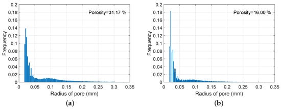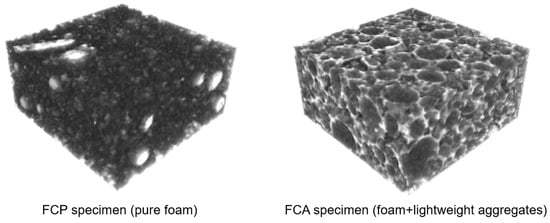 The pore structures which strongly affect material properties were investigated using the pore part of each specimen. Based on the used pixel (voxel) resolution, the minimum pore size taken into consideration here was 29.8 m, with the porosity and pore size distribution being computed using the voxel volume-based information, assuming all the pores were spherical [,]. Thus, the pores with the volume less than the image resolution were neglected, and this can affect relatively lower porosity than the actual value due to the limited resolution of the used images. The measured porosity of each specimen was 31.17% (FCP) and 16.00% (FCA). The pore size distributions of the used specimens are presented in Figure 8. In this figure, the total area of the pore size distribution for the FCP specimen is about twice that of the FCA specimen, which is consistent with the porosity trend. In particular, this tendency is more clear for pores larger than 50 m; the relatively large pores clearly existed in the FCP specimen, while the FCA specimen had a higher proportion of smaller pores (<50 m). This indicates that pore foamed concrete tended to include larger pores, and that material with lightweight aggregates contained numerous smaller pores since the binder was filled with aggregate particles that include fine pores inside the materials. The measured characteristics confirmed that the general pore structure of foamed concrete can vary, depending on the inclusion of lightweight aggregates.