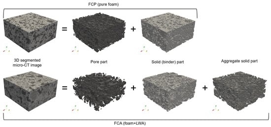 Figure 5 shows an image process for classifying the pore and solid from the FCP and FCA specimens, used for the characterization of the materials. The samples for the micro-CT measurement were selected from the whole specimen which used as a core material of the VIP sample. Cubes of 20 mm edge dimensions were scanned, and a total of 600 slices were recorded. The 1st and 2nd images are the original 8-bit micro-CT image and its region of interest (ROI), respectively. Among the images of the whole specimen, for more effective description, the region of interest (ROI) with 400 × 400 × 200 voxels (x × y × z) was selected, which can be considered as representative volume of the specimens. The ROIs and the binary images in Figure 5 are composed of 400 × 400 pixels with 29.8 m/pixel. To segment the pores from the ROIs, a threshold was selected using the Otsu method [] and manual confirmation, with the binary image being generated using the thresholding methods and the imaging toolbox in MATLAB (R2019b) []. In the binary image of the FCP specimen, which is pure foamed concrete, the black represents the pores, and the white represents the solid phase. For the FCA specimen, the segmentation is more complex because of the lightweight aggregates in the material. As can be seen in the lower images in Figure 5, lightweight aggregate particles have a more rigid solid than the matrix, which are described in light and dark grayscale according to their relative densities, respectively. This indicates that the aggregate solids are denser than the matrix and have different characteristics and properties. The segmentation of pores, aggregates, and the matrix was conducted using a multi-level thresholding approach [,]. As shown in Figure 6, the converted images were subsequently stacked, and the obtained 3D images were utilized for characterization and numerical analysis.