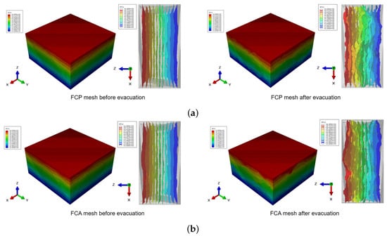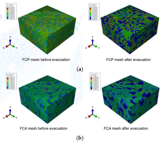 For a more detailed analysis of evacuation performance, numerical characterization and simulation were also performed. Thermal simulation was performed using the 3D micro-CT image in Figure 6 by converting it into finite element meshes. Figure 7 shows the finite element meshes of the FCP and FCA specimens. For the FCP specimen, the whole specimen was classified into pore and solid parts, while the FPA specimen was divided into three phases: pore, binder, and aggregate solid.