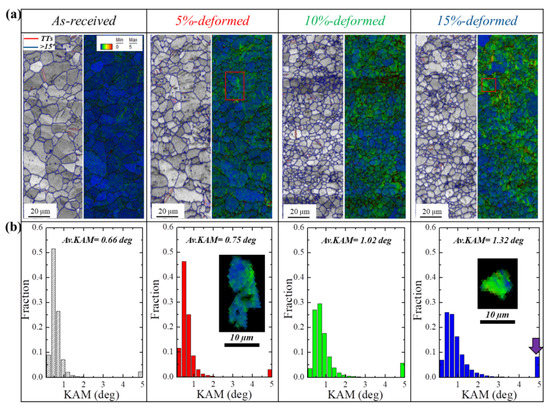 Figure 1a shows the image quality (IQ) map superimposed with the grain boundaries of as-received and stretched samples. It is evident from the IQ map that the as-received alloy consisted of an equiaxed fine-grained (7.9 µm) structure. The IQ map of 5%-stretched sample revealed a less homogeneous microstructure, containing randomly distributed fine and coarse grains. The IQ map of 10%-stretched sample showed a microstructure mostly composed of fine grains, suggesting that further deformation leads to a decrease in overall grain size, where a higher proportion of low angle grain boundaries (misorientation angle (𝜽) < 15°) can be noticed (represented in green color) as compared to the 5%-stretched sample. In general, dynamic recrystallization (DRX) is used to explain the formation of fine-grained structure during plastic deformation of Mg-based materials. In order to activate the DRX, Mg materials should be stretched at elevated temperatures, and this can be enhanced using high-strain-rate stretching. However, in the present experiments, a room-temperature deformation was employed, and, accordingly, the formation of the finer-grained structure cannot be fully figured out based on the occurrence of DRX; especially, no clear microstructural evidence was found through EBSD measurements. The evolution of the finer structure during the stretching of this alloy might be related to the dislocation accumulation near the grain boundaries, which leads to formation of a substructure. This is shown through the kernel average misorientation (KAM) measurements conducted by EBSD, as shown by the KAM maps of the 5% sample inserted in Figure 1. As is well established, the KAM value shows the presence of geometrically necessary dislocations (GND) that are related to local lattice distortion or localized deformation. In this regard, a microstructure can be regarded as a strain-free structure if its average KAM value is less than 1° [21]. Further deformation to 15% leads to a higher proportion of low-angle grain boundaries (𝜽 < 15°, shown in green color), where a simultaneous increase in the grain growth energy resulted in a slight increase in grain size, as evident from Figure 1a.