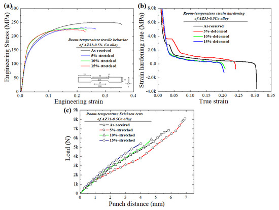 (a) Room-temperature tensile curves (figure inset in (a) shows the dimensions of the tensile samples); (b) strain hardening behavior, and (c) Erichsen cupping test curves of the as-received and pre-stretched (5%, 10% and 15%) samples.