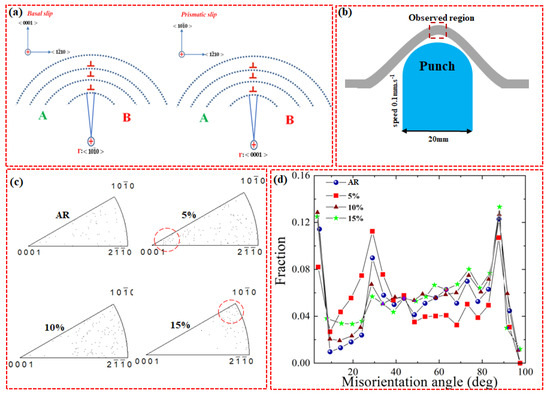To determine the slip system, which might be activated during deformation, in-grain misorientation axes (IGMA) analysis was performed on the samples (as-received and pre-stretched) after the Erichsen test. It is already established that IGMA analysis can determine slip-induced lattice rotation and accordingly can identify its rotation axis [35,36]. Generally, the presence of dislocations can bend the crystal which, in turn, can lead to in-grain misorientation (2.5–5°). This bending occurs around an axis (Taylor axis) and rotates the crystallographic planes about that axis (Figure 5a). Hence, the dominant slip system in the deformed sample can be determined by comparing the Taylor axis of slip system to the IGMA. For instance, a misorientation axis close to can be induced by activation of <a> basal slip while <a> prismatic slip is indicated by a misorientation axis close to . To measure the IGMA of the samples (as-received and pre-stretched) after the Erichsen test, the top region of the stretch-formed sample was analyzed as schematically shown in Figure 5b. Figure 5c shows the IGMA analysis performed on the samples (as-received and pre-stretched) after the Erichsen test. It can be seen that the IGMA for the 5%-stretched sample is mostly concentrated along , which is indicative of the activation of prismatic slip. On the other hand, IGMA distributions for the 10%- and 15%-stretched samples are lying along and , which suggest that basal slip is the dominant deformation mechanism in these samples. Accordingly, the high activity of prismatic slip in 5%-stretched sample is believed to be responsible for its high stretch formability. Figure 5d shows the misorientation profiles of the stretched samples after the Erichsen cupping test. It is clearly seen that the 5% sample shows less fraction of misorientation at 86° (tension twins [37]), indicating that the plastic deformation of this sample (5%) during the Erichsen cupping test was more controlled by the non-basal slip systems. In the present work, the high activity of prismatic slip in this alloy (AZ31-0.5Ca alloy) was explained in a previous work and attributed to the formation of (Mg,Al)2Ca particles, which increase the stress needed to activate the basal slip, and as a result, decrease the relative CRSS (τPrismatic/τBasal). In the present work, however, all stretched samples have the same composition. Accordingly, the slightly higher activity of the non-basal slip systems in the 5%-stretched sample during and after the Erichsen test is mainly explained based on the texture characteristics evolved in the sample after the stretching experiments.