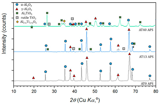 - Berger, L.-M.; Sempf, K.; Sohn, Y.J.; Vaßen, R. Influence of Feedstock Powder Modification by Heat Treatments on the Properties of APS-Sprayed Al2O3-40% TiO2 Coatings. J. Therm. Spray Technol. 2018, 27, 654–666. [Google Scholar] [CrossRef]