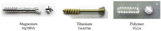 Titanium small fragment screws 1.7–1.8 mm in diameter [41] have been shown to have sufficient compressibility [22,42] and strength [43] for mandible head osteosynthesis. As shown by the tests performed, the strength of the magnesium screw is significantly higher than that of the polymer screw. At this point, it should be noted that screws of different diameters were tested. This is an obvious methodological limitation, but the screws shared a common medical purpose and length. In brief, 14 mm screws from one manufacturer that were made specifically for the osteosynthesis of the mandible head were tested. Most likely, the screws were made to have different diameters due to the differences in the mechanical properties of PLGA, MgYREZr, and Ti6Al7Nb. If the screws had the same diameter, it is clear that the PLGA screw would be the weakest and the Ti6Al7Nb screw would be the strongest. In addition, a thin PLGA screw would be useless for osteosynthesis of the mandible head. Therefore, it would probably not be possible to discover that the axial pull-out force is the highest for MgYREZr and not for Ti4Al7Nb.