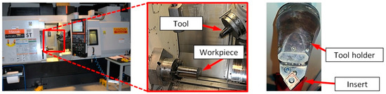 Cutting inserts CNMG 120408-SMC (nose radius rƐ = 0.8 mm) grade 1115 and tool holder C6-PCMNN-00115-12HP produced by Sandvik Coromant (Sandviken, Sweden) were applied in research. The test stand with the cutting tool is shown in Figure 1.
