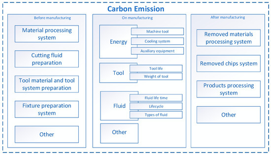 Energy requirement (power consumption) is an important component in CNC machining systems. Actions aimed at reducing power consumption during machining directly affect lower carbon emissions into the environment [43]. Based on analysis of publications Gutowski et al. [2], Jia et al. [43] and Yi et al. [42] the scheme of carbon emissions of a CNC machining system was developed by the authors, and is shown in Figure 3.