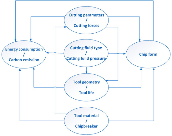 In the cutting process, a change of one parameter directly affects the change of other parameters describing the process. Figure 4 shows the correlation between cutting parameters and their effect on current consumption and chip geometry. For example, a change increasing the feed value leads to the correct chip geometry, but, at the same time, the change results in a decrease of the tool life and an increase of cutting forces, and, thus, an increase in current consumption and carbon emissions. Similarly, the shape of the chip breaker directly affects the form of the chips and the power demand, as well as the change in the value of cutting forces, which causes a change in the tool, etc.