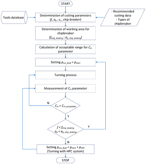 Figure 5 shows a general algorithm for minimizing power consumption in the turning process using HPC system, due to the chip geometry. The algorithm takes into account the cutting tool ranges (depth and feed) recommended by the manufacturer, for which a correct (broken) chip geometry and type of cooling (dry and HPC) are obtained. Based on the cutting tool manufacturer’s recommendations, the cutting parameters (f, ap, vc) and the chip breaker type are adopted. Next, the chip breaker working area is determined, i.e., the parameter ranges for fchip breaker and ap chip breaker. The chip geometry is determined by the chip breakage index Cin. The turning process starts with dry machining. Then, during the cutting process, the condition of exceeding the accepted value of the Cin acceptable index is checked, and the area of the chip breaker working field is used for the feed f and cutting depth ap. In the next step, if the chips are obtained in an unfavorable form (Cin > Cin acceptable) and the incorrect operation of the chip breaker, the decision is made to apply increased coolant pressure. In the case where the chip breaker performs its work correctly (short chips are obtained), HPC machining is not applied.