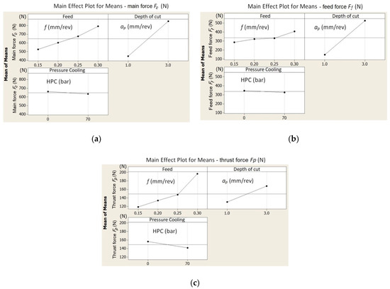 The influence of the cutting data on the values of the total cutting force components: (a) Fc, (b) Ff, and (c) Fp.