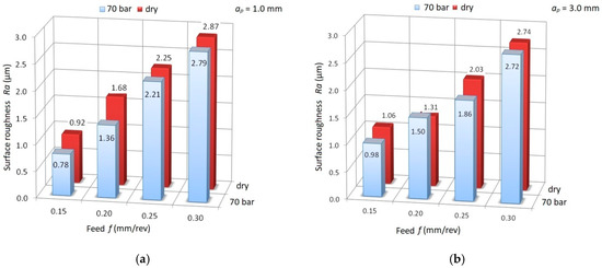 Dependence of surface roughness (Ra) for dry and high-pressure cooling (HPC) turning for (a) cutting depth ap = 1.0 mm; (b) cutting depth ap = 3.0 mm.
