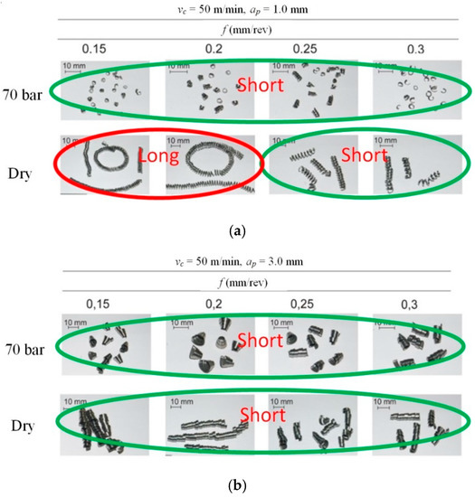 It follows from the above that increasing coolant pressure in the cutting process mainly supports the chip breaking process. Therefore, an analysis of the chip geometry obtained in experimental studies was carried out. Figure 8 shows photographs of chips of various forms. Short, broken chips were obtained in all cutting tests with HPC pressure p = 70 bar. For dry machining, a change of the form of chips from long to short was observed by increasing the feed values f and cutting depth ap, and, hence, higher values of the cross-section of the chip were created. This is due to the better filling of the chip groove by the created chip. This phenomenon was also analyzed by Balaji et al. [48].