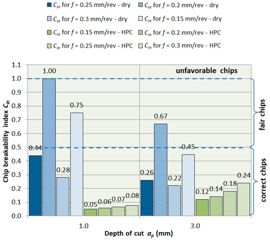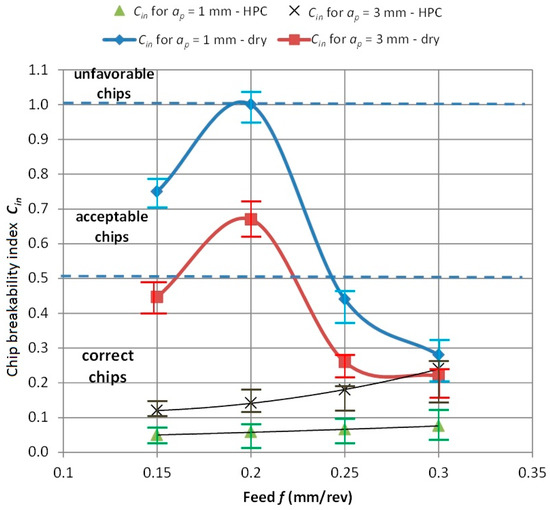 Figure 9 and Figure 10 show the dependence of the chip breaking index Cin from the feed f and depth of cut ap. The drawings indicate three areas for classification of correct, acceptable and unfavorable chips. It can be seen that in the case of dry machining, the chip geometry is variable and depends on the feed value f. In the feed range of 0.15 < f < 0.25 mm/rev, three forms are observed. For tested feed f > 0.25 mm/rev, a correct chip shape was obtained with the Cin coefficient similar to HPC machining.