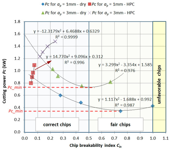 Figure 11 shows the dependence of the Pc power demand as a function of the chip breaking ratio Cin. The presented relationships show that a correct and acceptable form of chips can be obtained with a reduced demand of cutting power. The minimum value Pcmin depends on the feed value f and depth of cut ap, i.e., on the cross-section of the cut layer. The machining method, in this case the change from dry machining to HPC machining, reduces the value of the Cin chip breakage index (i.e., shorter, more broken chips) but also significantly increases the demand for cutting power Pc.