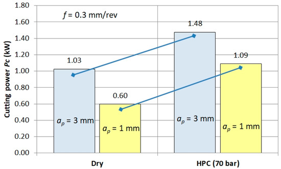 An exemplary combination of Pc power for dry machining and HPC is shown in Figure 12. It follows that the power demand for HPC machining is greater by about Pc ≈ 0.5 kW. This also confirms the thesis that, due to the form of chips, the application of the machining process at elevated pressure should be reduced.