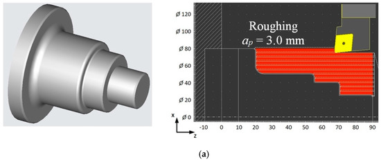 In connection with the above, a case study was carried out, for which the algorithm shown in Figure 4 was used. It was assumed that the workpiece was a stepped shaft with external dimensions Ø50 × 80 mm. The cutting depth for roughing operations is ap = 3.0 mm and for finishing ap = 1.0 mm. The number of passes for rough turning n = 11 and one pass for finishing turning along the contour were assumed.