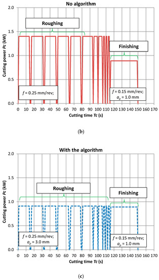 Figure 13a shows a view of the workpiece and the cutting tool path during roughing turning. Figure 13b shows the diagram of power demand for the case of HPC turning throughout the entire cutting time (Tc). Figure 13c depicts the diagram of power demand for the case of HPC turning with the implementation of the algorithm. As a result, the cutting power for rough turning was reduced, while ensuring the required chip geometry.