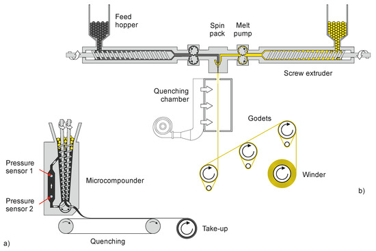 - Hufenus, R.; Reifler, F.A.; Maniura-Weber, K.; Spierings, A.; Zinn, M. Biodegradable Bicomponent Fibers from Renewable Sources: Melt-Spinning of Poly(lactic acid) and Poly[(3-hydroxybutyrate)-co-(3-hydroxyvalerate)]. Macromol. Mater. Eng. 2011, 297, 75–84. [Google Scholar] [CrossRef]