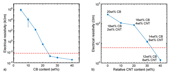 - Ma, P.-C.; Liu, M.-Y.; Zhang, H.; Wang, S.-Q.; Wang, R.; Wang, K.; Wong, Y.-K.; Tang, B.-Z.; Hong, S.H.; Paik, K.-W.; et al. Enhanced Electrical Conductivity of Nanocomposites Containing Hybrid Fillers of Carbon Nanotubes and Carbon Black. ACS Appl. Mater. Interfaces 2009, 1, 1090–1096. [Google Scholar] [CrossRef] [PubMed]