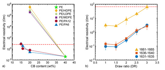 - Tchoudakov, R.; Breuer, O.; Narkis, M.; Siegmann, A. Conductive polymer blends with low carbon black loading: Polypropylene/polyamide. Polym. Eng. Sci. 1996, 36, 1336–1346. [Google Scholar] [CrossRef]