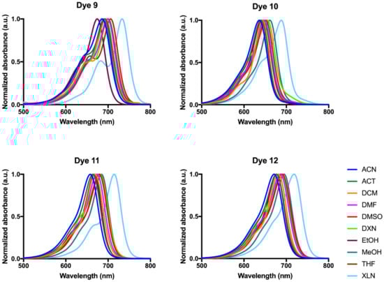 Normalized red and near-infrared absorption spectra of quinoline- and benzoselenazole-derived unsymmetrical squaraine cyanine dyes 9–12 acquired in acetonitrile (ACN), acetone (ACT), dichloromethane (DCM), dimethylformamide (DMF), dimethyl sulfoxide (DMSO), 1,4-dioxane (DXN), ethanol (EtOH), methanol (MeOH), tetrahydrofuran (THF) and xylene (XLN) at room temperature. Absorption is presented as arbitrary units (a.u.).