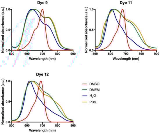 Normalized red and near-infrared absorption spectra of quinoline- and benzoselenazole-derived unsymmetrical squaraine cyanine dyes 9, 11 and 12 acquired in dimethyl sulfoxide (DMSO), Dulbecco’s modified Eagle medium (DMEM), water and phosphate-buffered saline (PBS) at room temperature. Absorption is presented as arbitrary units (a.u.).