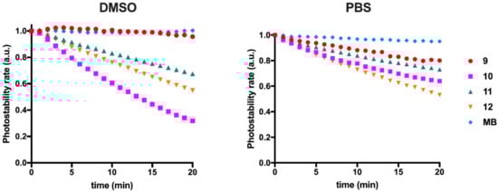 Photostability rate, in arbitrary units (a.u.), of quinoline- and benzoselenazole-derived unsymmetrical squaraine cyanine dyes 9–12 and methylene blue (MB) in dimethyl sulfoxide (DMSO) and phosphate-buffered saline (PBS). Dye solutions were irradiated repeatedly with a light-emitting diode system emitting at 630.2 ± 0.8 nm and radiant flux of 4.3 ± 0.5 mW for periods of 1 min for 20 min.